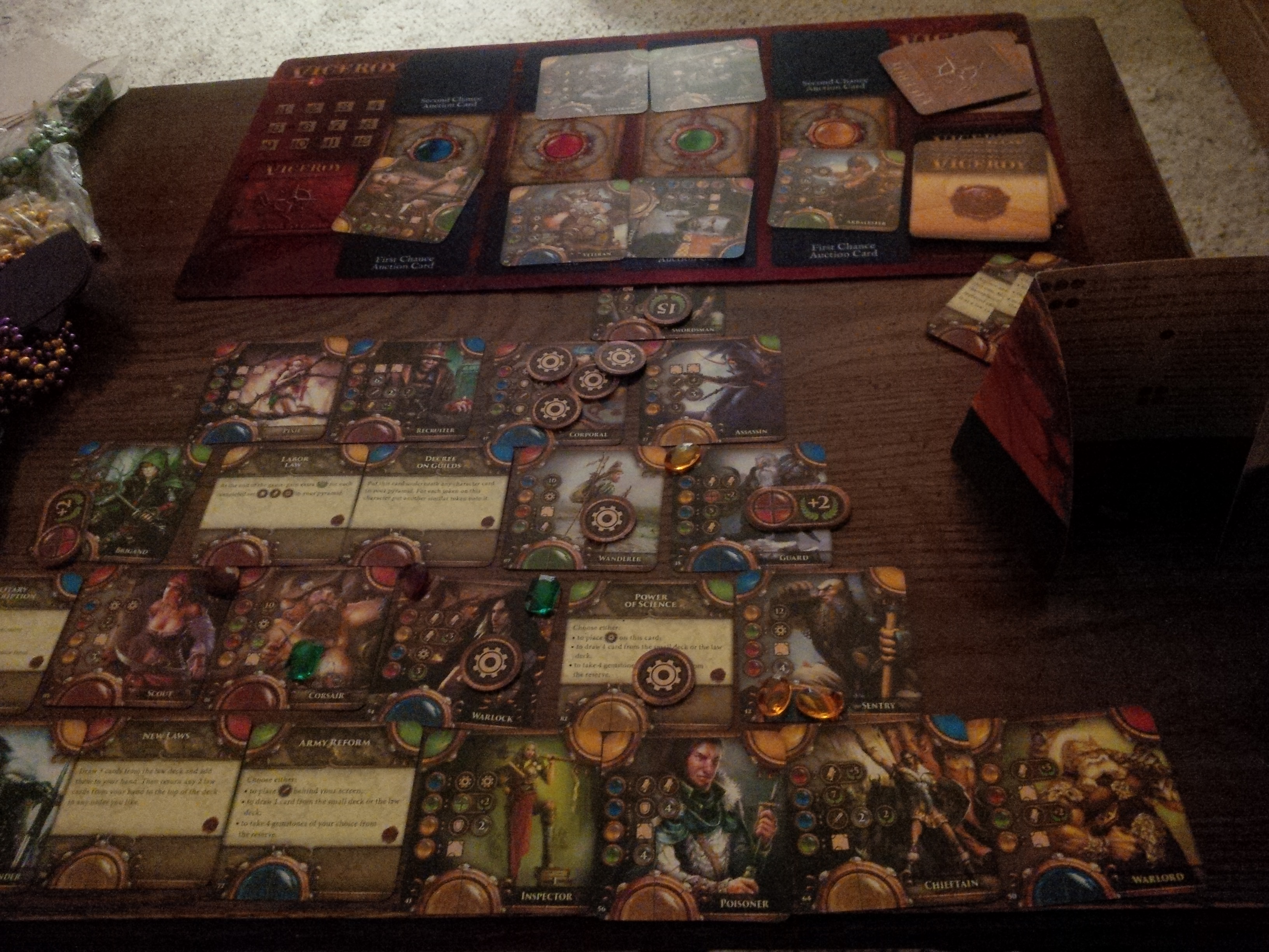 Overall, I find Viceroy a lot of fun. The tableau-building experience has some similarities to games like San Juan or Race For The Galaxy, but this doesn’t have the role-selection of those titles, and instead incorporates clever auctions and even more different ways to use cards. Where you play cards matters, both for the differing reward levels and for trying to get completed circles. This also means that the same card can have different value to you from game to game, depending on what resource you need at the moment and how it lines up with the other cards you have. That, plus the different point-generating strategies, reminds me a bit of 7 Wonders; card value can be highly situational, and taking cards others may desire or focusing on cards they’re likely to ignore can both be viable strategies.