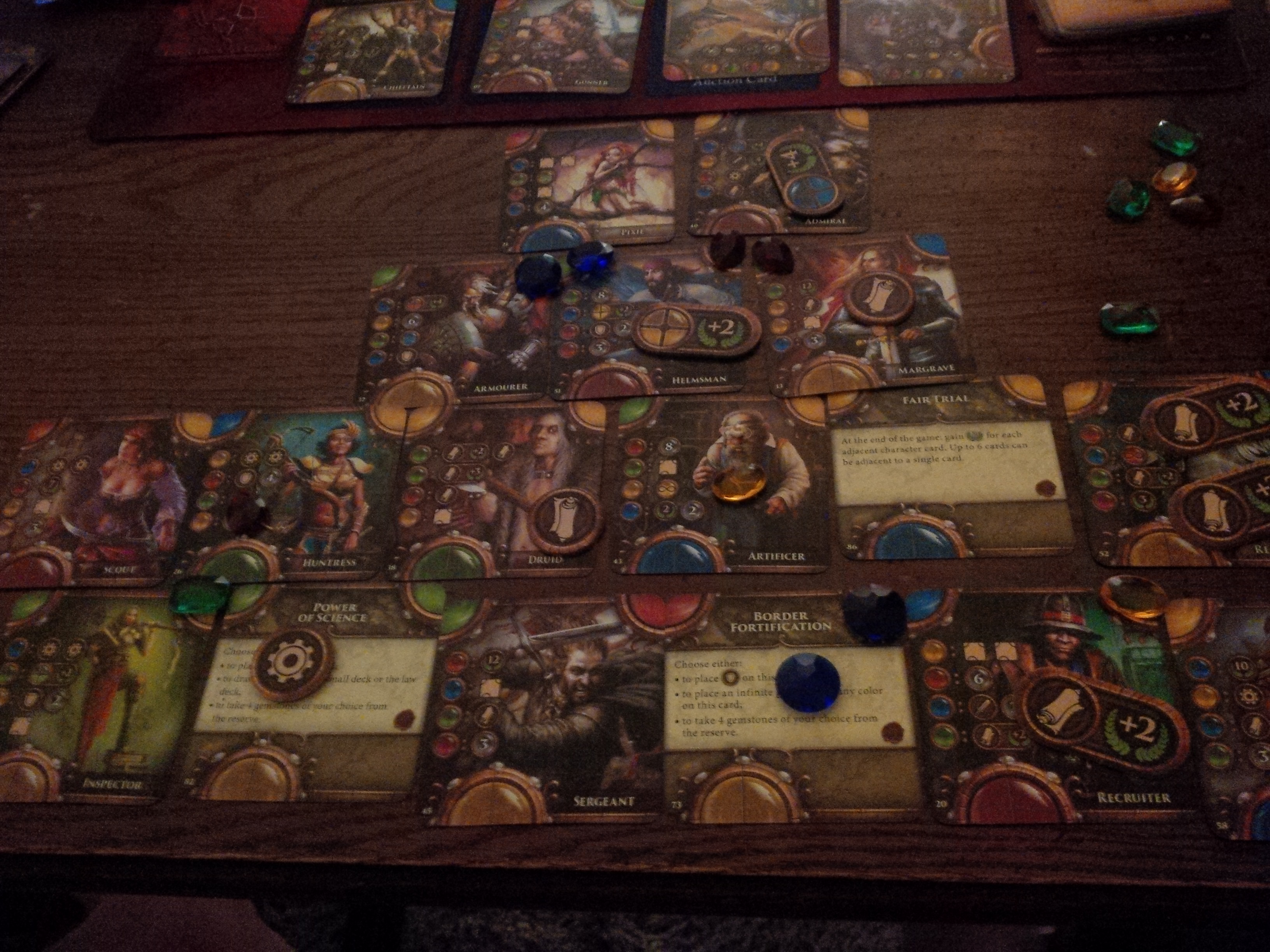 Circles? Yes, that’s one of this game’s neatest twists. The character cards and law cards also have coloured quarter-circles in the top left and right corners and a coloured half-circle at the bottom. If you can get those to align for a complete circle (for example, red in the top right of a level-one card, red in the top left of its right-most neighbour, and red in the bottom of the level-two card above them), you instantly get a gemstone of that colour, and you’ll get further rewards at the end of the game. Completed circles are worth as many points as their highest level (so the preceding one’s worth two), but there are also tokens you can get from cards that boost the value of certain circles. This brings a whole different level of spatial thinking into which cards you obtain and where you play them. It doesn’t have to be perfect, either, as you can “paint” incomplete circles with leftover gems of the appropriate colour, so getting close can be rewarding too.