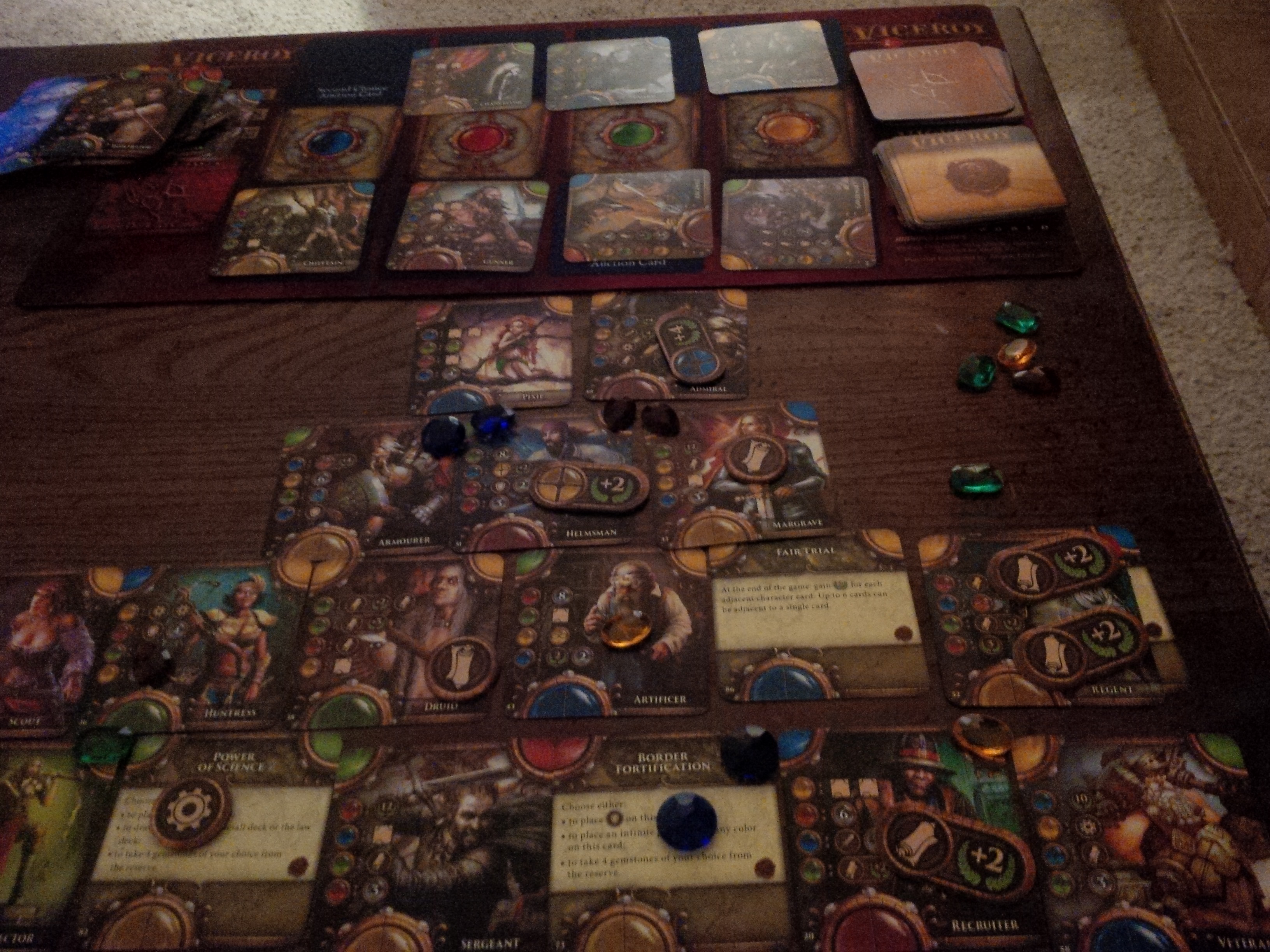 The end-game scoring of Viceroy shows how many different possible paths to victory there are. You’re rewarded for completed circles, for infinite gemstones (which count as completed circles on the level they’re at), for law cards that provide victory points, for victory point tokens on your cards, for magic (but you need to have both magic tokens and tokens that make magic tokens valuable), and for completed sets (each set of a science, magic and defence token gets you 12 points). Many of these different rewards can be a viable strategy to focus on, as can being a generalist with some points in each category.