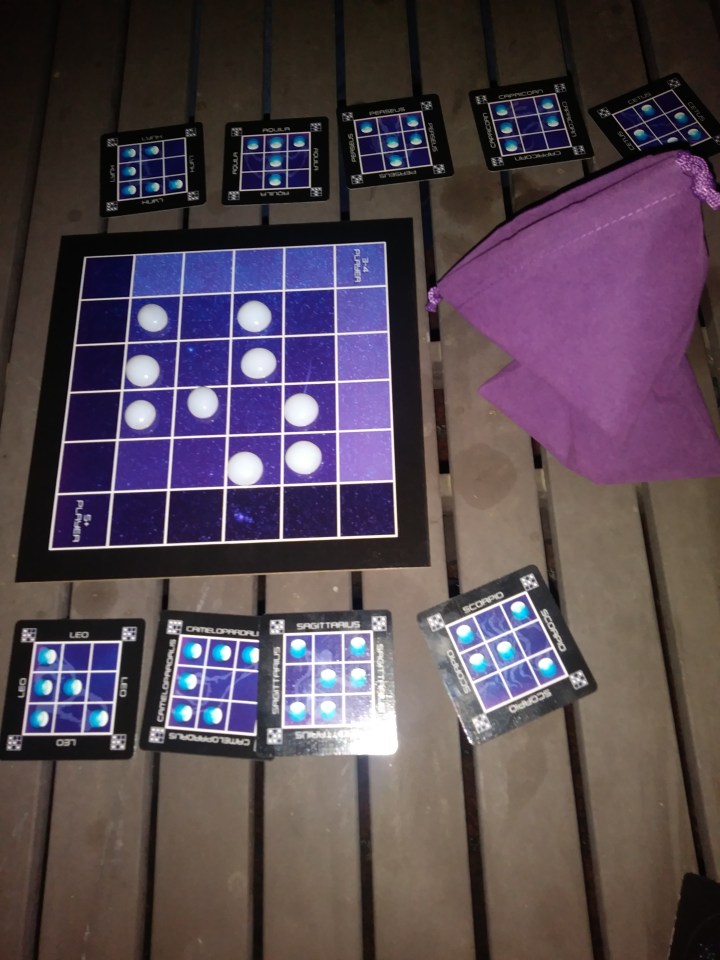 It’s much more about setting up multiple possibilities for yourself (especially early in the game while you still have all your cards), and about taking advantage of what other people play. And the hidden goals mean that you can’t easily prevent what your opponents are trying to do; sure, you can remove a stone they’ve played (except in the two-player game, where you can’t undo exactly what they just did to avoid stalemates), but that’s not necessarily all that helpful, especially compared to trying to build your own constellations.